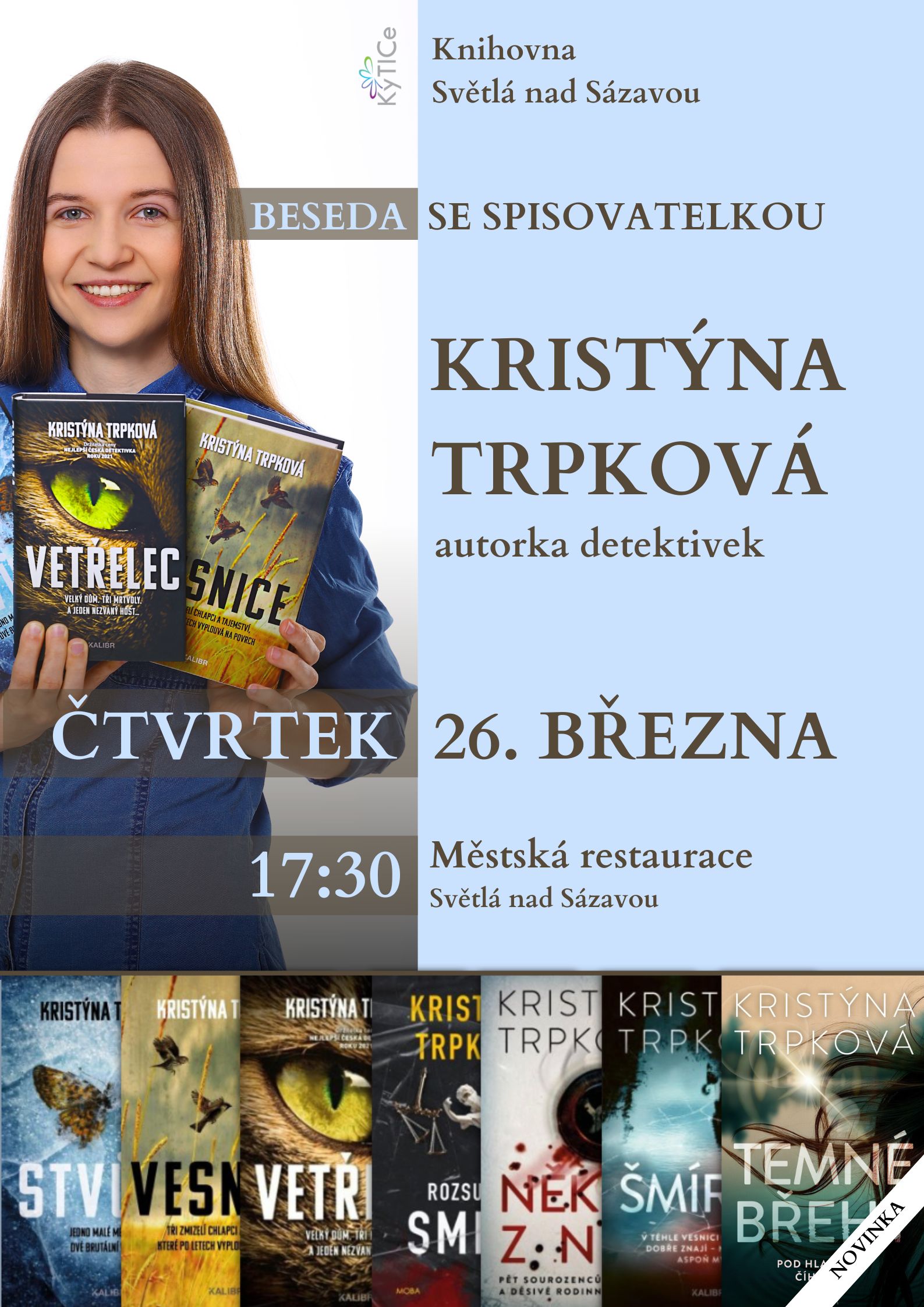 Rezervace vstupenek je možná pouze na tel. 775 653 884, e-mailu info@kyticesvetla.cz nebo osobně v Infocentru. Rezervace platí pouze 5 dnů. Vstupenky je nutné si do té doby vyzvednout během otevírací doby v Infocentru. Veškeré nevyzvednuté rezervace se automaticky 5 dnů před akcí uvolňují zpět do prodeje. Rezervace vstupenek až do akce není možná. Zákazník bere na vědomí, že rezervace je nezávazná a v případě, že si vstupenky nevyzvedne ve stanoveném čase, může prodávající vstupenky uvolnit k prodeji bez dalšího oznámení zákazníkovi. Rezervaci lze odvolat osobně nebo telefonicky v Infocentru. Zákazník bere na vědomí a bezvýhradně souhlasí, že jím zadané kontaktní údaje mohou být zaznamenány v systému za účelem pozdějšího kontaktování prodávajícím.
